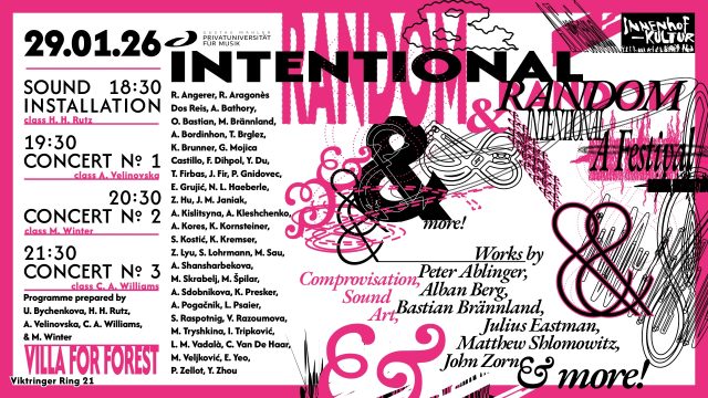 Beginning at 18:30, the event will open with a collaborative sound installation Quotidian Reminiscence in the garden of Villa for Forest. The sonic positions of the installation are distributed across the outside space, inviting listeners to roam around and encounter dialogues among eight micro-compositions that capture moments of habitual personal contexts. The installation will remain active throughout the entire event, providing an immersive sonic backdrop to three distinctive concerts. At 19:30, the first concert features a new work by Klagenfurt-based composer Bastien Brännland, alongside Matthew Schlomowitz's Letter Piece #5: Northern Cities, for two players performing music, actions, and text; Alban Berg’s 4 Stücke, Op. 5, which delves into virtuosic atonality through extended techniques such as flutter-tonguing and extreme dynamics; and John Zorn’s seminal "game piece" Cobra, where performers shape the music in real time through cues and gestures. The 20:30 concert showcases Julius Eastman's minimalist masterpiece Stay On It – a work by a composer whose brilliant contributions were almost completely lost but have recently achieved high acclaim – paired with Peter Ablinger's noise piece Nanophony for soft sounds and loud amplification. The final concert at 21:30 will conclude the evening with an experimental improvisation designed and performed by a quintet of composer-performers, sympathetically agitated by Christopher A. Williams.